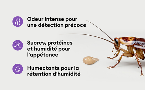 Die Qualität der Formulierung (Feuchtigkeit, Textur, Tröpfchengröße) beeinflusst die Nahrungsaufnahme, sobald sich die Schabebereits in der Nähe befindet.